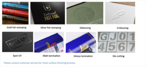 1.Glossy/Matte Lamination 2.Through UV/ Sopt UV 3.Hot Stamping(foil-gold, silver,red etc.)